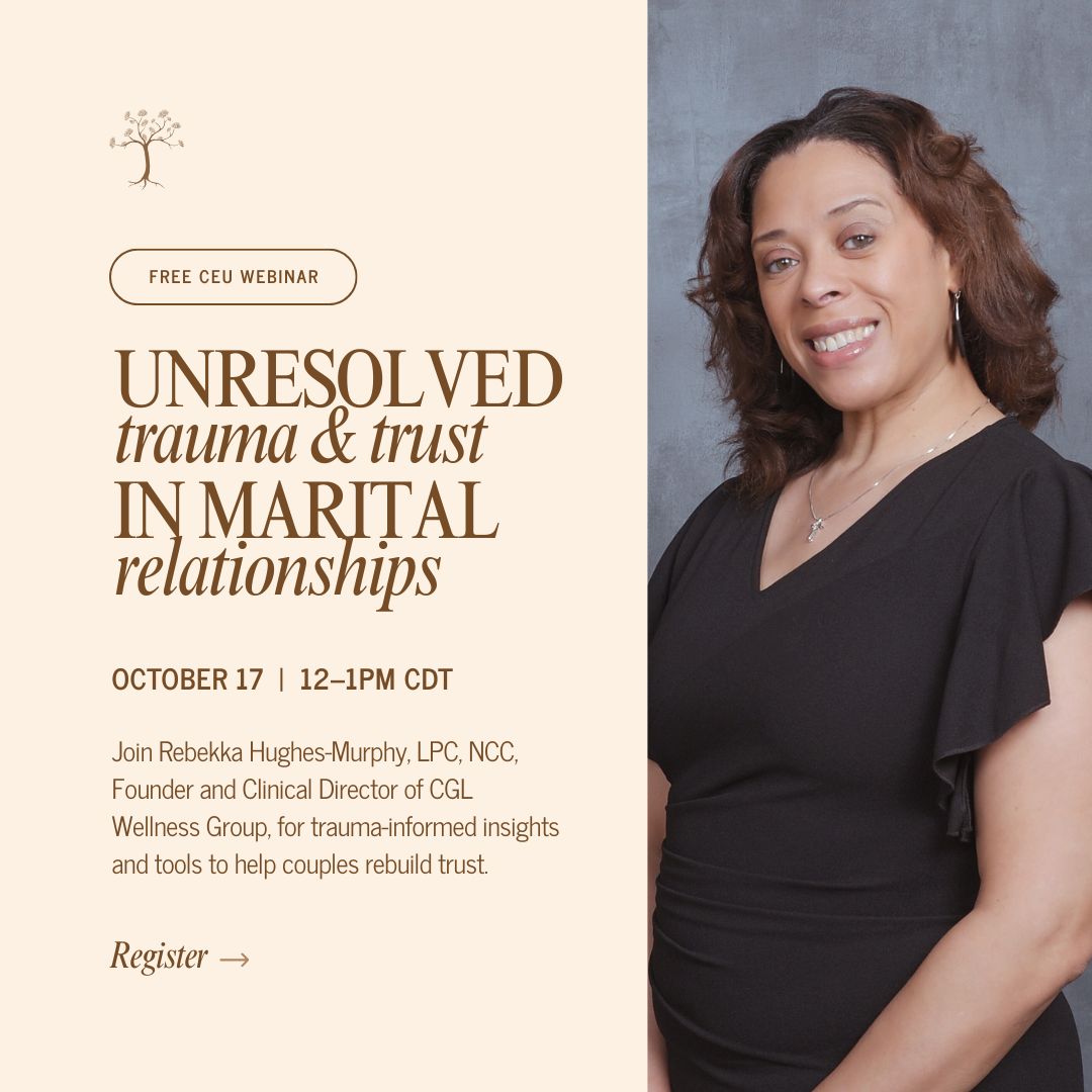 Trust is the foundation of a healthy marriage, but unresolved trauma can quietly weaken that bond. Join Rebekka Hughes-Murphy, LPC, NCC, the Founder and Clinical Director of CGL Wellness Group, in our upcoming webinar on how unresolved trauma impacts trust in marital relationships.